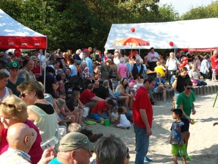 Das diesjährige Spielplatzfest des Ortsvereins Maudach fand bei herrlichem Wetter wie gewohnt auf dem Spielplatz Kleestraße/Mittelstraße statt. Im Vorfeld hatten sich wieder zahlreiche SPD-Mitglieder um das optische Erscheinungsbild des Spielplatzes und der Spielgeräte gekümmert. Für das große Jubiläumsfest wurden dann ein großes Zelt, eine Hüpfburg, viele kleinere Spiele wie Sackhüpfen und mehrere Stände mit Speisen und Getränken aufgebaut. So war es dann auch kein Wunder, dass über 500 Gäste unseren Kanzlerkandidten Peer Steinbrück begrüßten, als dieser um ca. 16 Uhr eintraf. Steinbrück bedankte sich in seiner Ansprache bei allen Helfern und unterstrich noch einmal eindringlich, warum es sich lohnt seine Stimme der SPD zu geben. Anschließend machte er noch einen Rundgang über den Spielplatz, unterhielt sich direkt mit den Menschen und ließ sich sogar eine "Gipshand" anfertigen. Wir bedanken uns bei allen Besuchern für ihr kommen und freuen uns auf viele weitere Spielplatzfeste.
