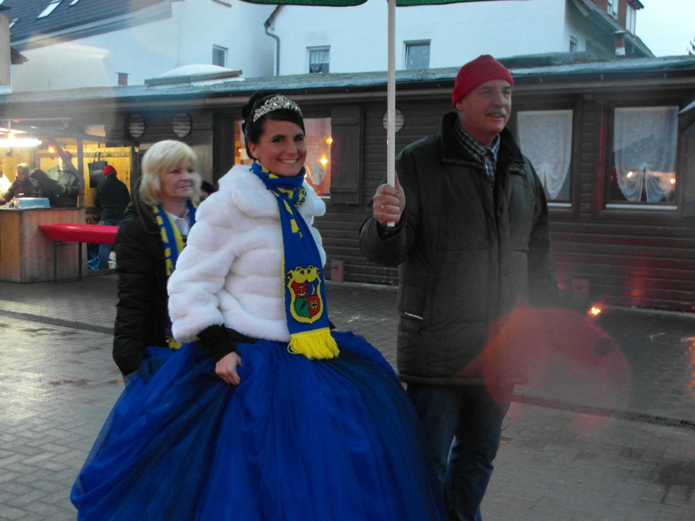 Eine gelungene Überraschung war der Besuch der Fasnachtsprinzessin Sabrina Schuchmann vom Maudacher Karnevalverein, den Mondglotzern. Sie konnte mit ihren Begleitern in Ruhe einen Glühwein trinken und sich mit den Besuchern unterhalten, denn Jürgen Bott vom SPD Ortsverein hatte spontan einen Sonnenschirm als Regenschirm umfunktioniert .